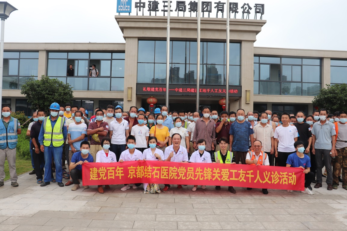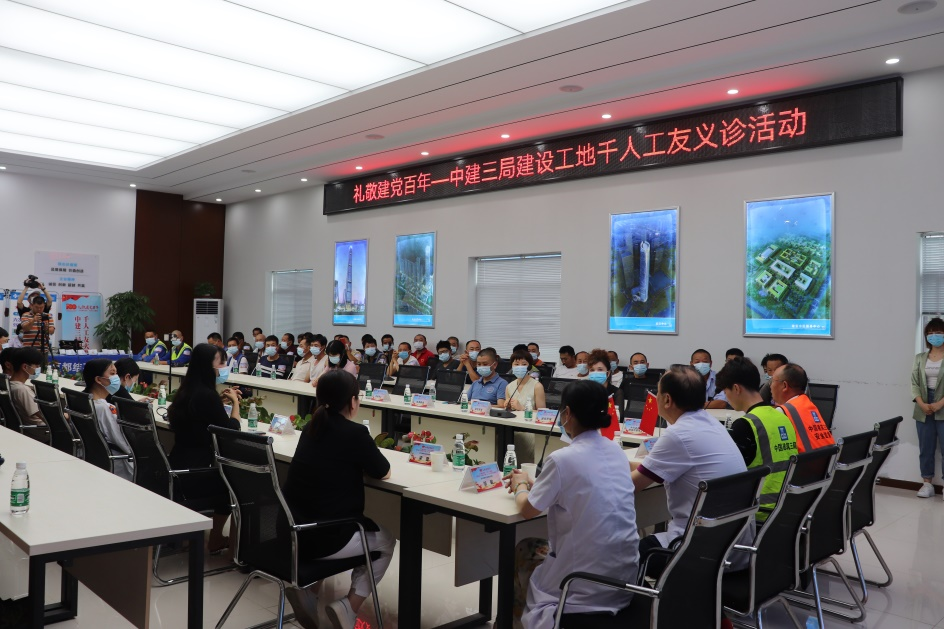 為熱烈慶祝中國共產(chǎn)黨建黨100周年,扎實(shí)推進(jìn)黨史學(xué)習(xí)教育,踐行“我為群眾辦實(shí)事”實(shí)踐活動,切實(shí)關(guān)愛建筑工友的身體健康,6月27日上午,中建三局武漢長江中心項(xiàng)目聯(lián)合武漢京都結(jié)石醫(yī)院,開展“關(guān)注城市建設(shè)·關(guān)愛工友健康”千人工友大型義診活動(以下簡稱“千人義診”活動)。中建三局武漢長江中心項(xiàng)目黨支部副書記黃業(yè)發(fā)、安全總監(jiān)黎長貴,武漢京都結(jié)石醫(yī)院黨支部書記劉陽光以及數(shù)百名建筑工人代表共同出席了啟動儀式。