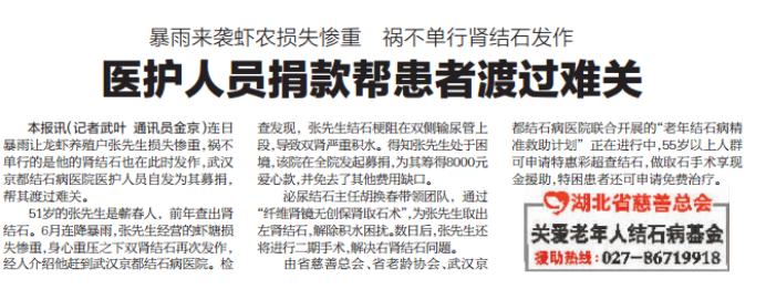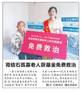 2017年7月19日,黃陂的孤寡老人黃成見因腎結(jié)石反復(fù)發(fā)作求助我院,院領(lǐng)導(dǎo)在初步了解了老人的家庭經(jīng)濟狀況之后,決定為老人提供湖北慈善關(guān)愛老年人結(jié)石病基金全程免費···